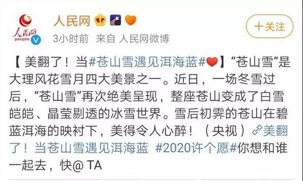人民網(wǎng)的微博也讀懂了這一點(diǎn),它說(shuō):“2020許個(gè)愿,當(dāng)蒼山雪遇上洱海藍(lán),你最想和誰(shuí)一起去!”