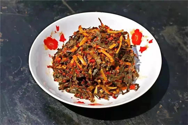 有人概括賓川所謂的“十八怪”,其中有“出外愛(ài)帶酸腌菜”這一“怪”。韭菜腌菜是賓川獨(dú)有的特產(chǎn),色澤金黃,聞著刺鼻,吃著爽口,可以單獨(dú)食用,也可作為炒菜中的輔料,特別適合炒肉和煮魚(yú)。