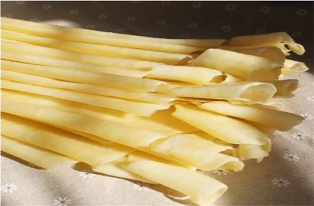 乳扇是以優(yōu)質(zhì)鮮牛奶為原料,混合三比一的食用酸漿加熱煉制凝結(jié),制為薄片,纏繞于細竿上晾干而成,因狀如折扇而得名。乳扇營養(yǎng)價值高、醇香可口,吃法也是各式各樣,生吃、干吃、油炸、煎烤,還可以做成甜點。生吃:如果是剛制作好不久的新鮮乳扇,可以不做任何加工,直接生吃,味道油而不膩,鮮醇清香,原汁原味,還不上火。
