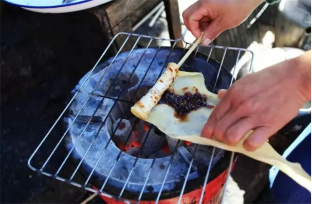 烤的過程中將乳扇平鋪成塊狀,用木棍掛住被烤軟的部分,依口味涂上煉乳或者玫瑰醬,邊卷邊烤,最后卷成筒狀??竞玫娜樯瘸脽嵋弦豢冢诟邢褴涇浀闹ナ?,稍冷卻后的烤乳扇嚼起來多了幾分韌勁,奶的清香與玫瑰醬的清甜在舌尖上碰撞,耐人尋味。