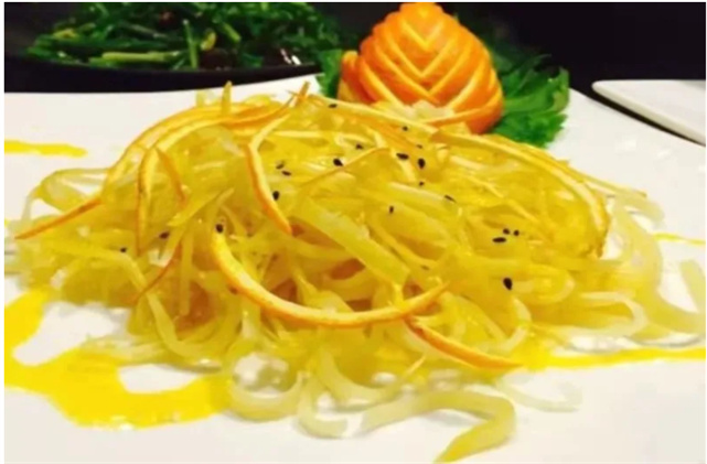 炒乳扇絲:先將乳扇用濕紗布包裹約20分鐘回軟后,一片一片地打開平鋪然后切成韭菜葉寬的絲,配上韭菜、青紅辣椒和里脊肉等拌炒,用高湯、糖和淀粉勾芡,直至色澤油亮,就可以起鍋了。乳絲勁道有嚼勁,奶味香濃,美味可口,營養(yǎng)豐富。
