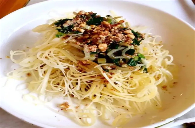 涼拌乳扇絲:乳扇切細絲,配上熱水焯過的韭菜,淋入各種作料,微酸的奶香撲鼻,為之陶醉。炒乳絲柔中有韌,潤滑鮮香,咸辣適當。