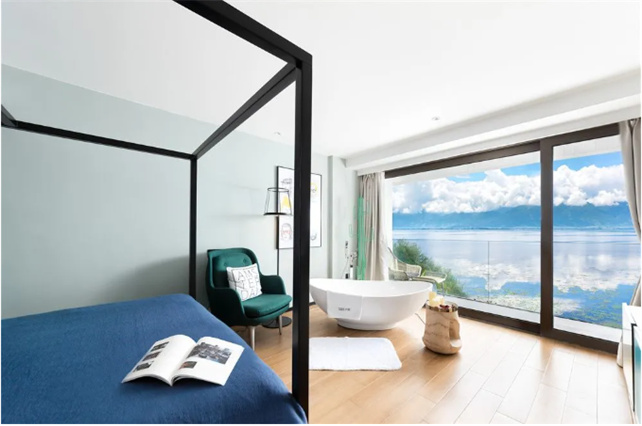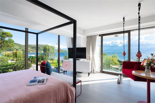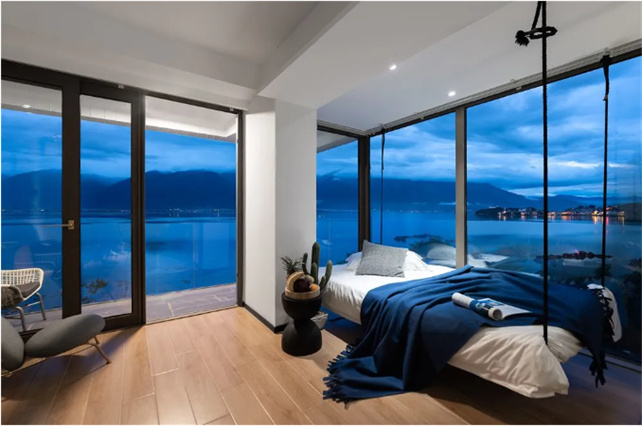 采用大面積全透明玻璃落地窗,酒店的海景客房仿佛都自帶一片海,蒼洱美景最大限度地呈現(xiàn)在房間內(nèi),高可賞連綿巍峨的蒼山,低可享瀲滟靜謐的洱海。