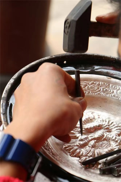 早在唐朝南詔時期,這里就有人從事金、銀、銅器手工加工工藝,現(xiàn)已有一千多年的歷史,銀器加工技藝聲名遠揚。鶴慶新華村的銀匠們,常年游歷,學習各地銀飾、銀器文化,提高自身的銀器加工制作技藝,秉持“千錘百鏨、守正創(chuàng)新”理念,精心打造民族手工藝特色產(chǎn)業(yè)集群,實現(xiàn)“前店后坊、產(chǎn)供銷一條龍”的生產(chǎn)經(jīng)營格局。如今,涌現(xiàn)出了一批如寸發(fā)標、母炳林等“新華銀匠”一樣的杰出代表人物,他們的作品也成為了當?shù)氐囊粡堨n麗的民族文化名片。