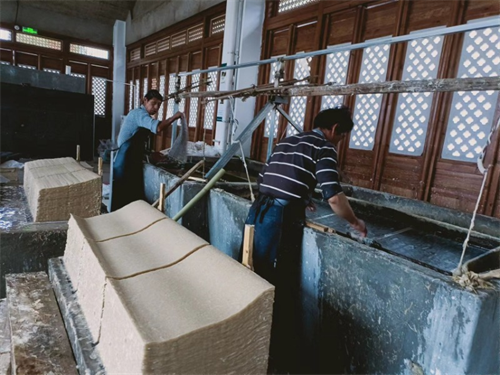 此外,白棉紙體驗作為鶴慶新華銀器小鎮(zhèn)的另一個新業(yè)態(tài),深受游客的喜愛。游客可以去鶴慶白族手工白棉紙傳承體驗中心體驗紙漿變紙張的神奇過程。撈紙師傅說:“傳統(tǒng)的白棉紙用的是構皮純手工制成,后來也有人添加過黃麻。撈紙漿的時候,越柔韌越好,技術好的師傅能把紙做得很均勻,很薄又不失韌性。等白棉紙制成以后主要是用于茶葉包裝、甲馬紙等?!泵彳浨矣匈|(zhì)感的白棉紙,你不得不被神奇的造紙技藝所折服。