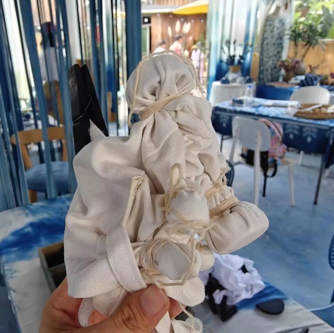 扎染的體驗(yàn)其實(shí)很快,就是利用店家給提供的一些小夾子大夾子還有在衣物上任意的打結(jié),形成各種的圖案,之后就可以把自己的作品放到大染缸里了,再之后的工序就是店內(nèi)工作人員的了,等到衣物投洗晾干以后,就可以得到自己獨(dú)一無(wú)二的扎染了。