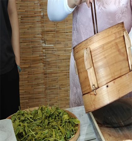 蒸汽殺青:利用高溫讓酶失去活性,停止多酚化合物的氧化過程,使茶葉在保持鮮綠品質(zhì)同時將鮮葉中的青臭味轉(zhuǎn)變?yōu)椴枞~清香。