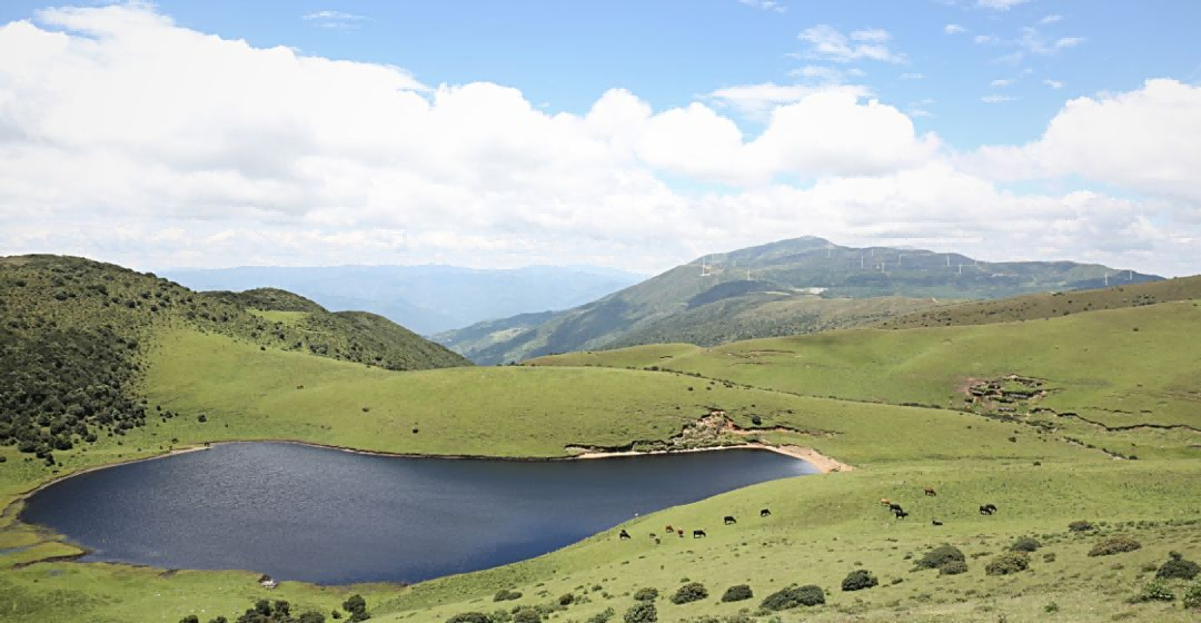 天鏡池與水滴池:天鏡池,位于東經(jīng)52.55,北緯25.57,海拔3529米,是鳳羽西南側(cè)最高山峰置于山顛的天然高山湖泊,成因不可考,可能是高原冰川湖泊。潭水分上下二潭,上潭稍大,呈長方形,長210-240米,寬130-160米,深1-2米許,近3萬平方米;潭內(nèi)水生植物豐富、水草茂盛,潭水清澈見底、蛙類眾多。下潭稍小,呈葫蘆型,長170米,寬35-110米,約1萬平方米,內(nèi)無水生植物與蛙類生存,潭口有上世紀五十年代修建的痕跡,下游濕地匯流成溪,是煉鐵鄉(xiāng)北邑河的主要水源地。整體來講,上下二潭是一個天然的高山濕地和草甸牧場,屬于瀾滄江水系黑惠江流域。