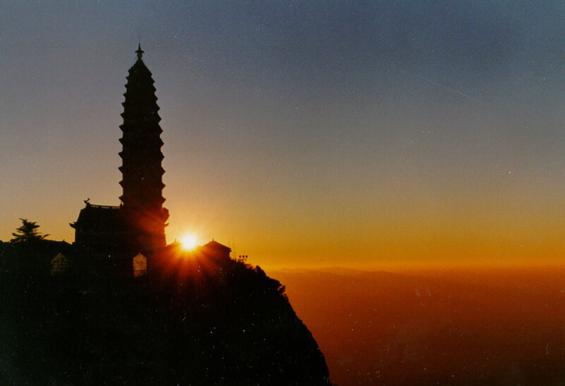 金頂寺。后來(lái)多數(shù)寺宇被毀,現(xiàn)僅存清代的祝圣寺、金頂寺大門和楞嚴(yán)塔。山間云霧縹緲,溪水琮琮,為中國(guó)佛教名山之一。