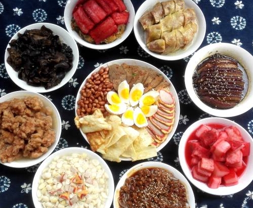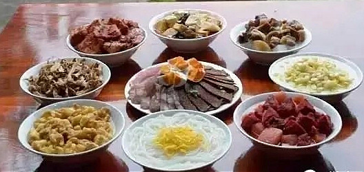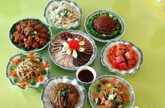 傳統(tǒng)的葷席八大碗,即紅肉、酥肉、粉蒸肉、千張肉、茶豆子、粉絲、木耳、豆腐皮春卷、百合加一個(gè)涼菜拼盤。