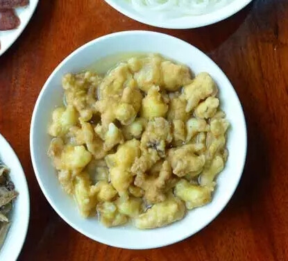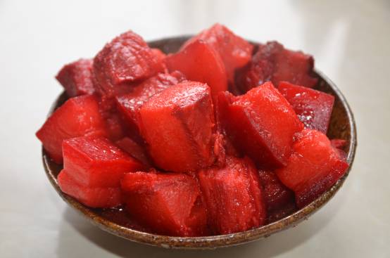 杉陽“土八碗”中的老大——紅肉,喜慶筵席上絕對少不了它的。美女們看著先別害怕,這四四方方紅得晶瑩透亮的肉肉,也許你吃了第一塊,還想吃第二塊。整桌菜品中,最代表喜慶的就是這碗用腿子肉做成的紅肉兒,肥肉多瘦肉少??上攵谀莻€(gè)葷腥大就代表生活水平高的年代,這道用紅色礦物質(zhì)“膏子”(俗稱“大紅”)點(diǎn)出來血紅油亮、大塊方正的豬肉讓人如何充滿食欲,吃起來又是如何過癮、滿足。