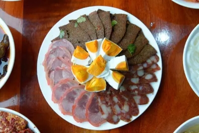 最后一道菜為拼盤“吉星高照,清清爽爽”。以白族傳統(tǒng)臘味淹鴨蛋﹑香腸﹑吹肝﹑肉片和辣椒蒜泥涼拌樹花拼成。