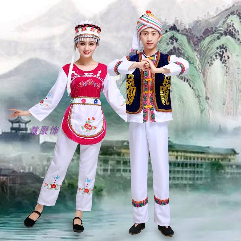 大理一帶多用繡花布或彩色毛巾纏頭,穿白上衣,紅坎肩,或是淺藍色上衣、外套黑絲絨領褂,右襯結紐處掛“三須”、“五須”銀飾,腰系繡花短圍腰,下穿藍色寬褲,足蹬繡花鞋。
