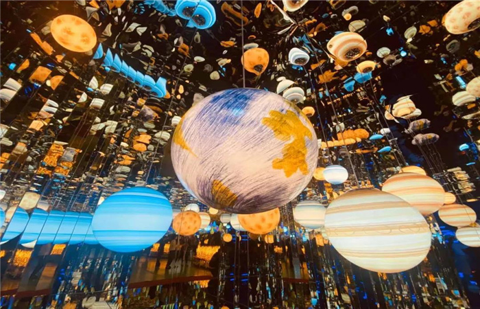 其中的流浪地球燈,近距離的感受不一樣的宇宙星空,當(dāng)你靠近燈盞時(shí)繽紛的色彩遂不及防地涌向你的雙眼,360度的鏡像、空靈的音樂氛圍、讓你如同身處迷離的幻境星空!