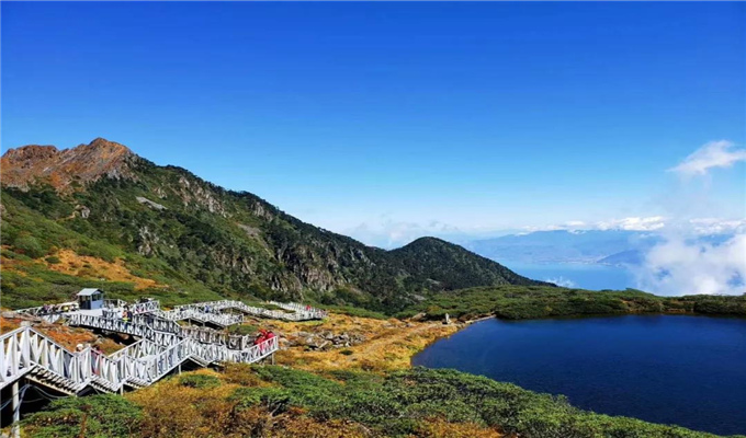 只有洗馬潭附近還盛放著零星的野花,天朗氣清,秋日爽朗就是這幅景象,沒有云霧遮擋的洱海就這么直接出現(xiàn)在眼前,湛藍的洱海與藍天互相輝映,秋意就這么在山巔流轉,明媚的秋天,山峰都披著絢麗的色彩。