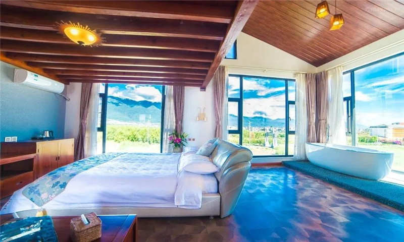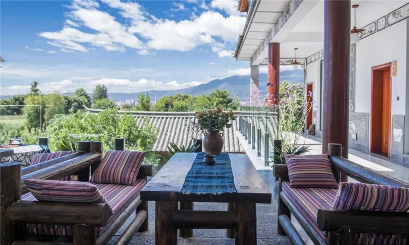坐在客棧的露臺(tái),映入眼簾的是遼闊的田野和洱海碧波。飲上幾杯清茶,抬頭看云飄過(guò),和輕拂的微風(fēng)說(shuō)幾句悄悄話,好不愜意。直至傍晚時(shí)分,看一場(chǎng)蒼山日落,任神思飛至天外,愁慮盡消。
