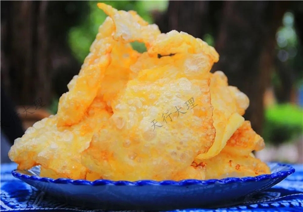 很多大理人,尤其是許多沿洱海而居的大理人,一定吃過炸魚鱗這道菜。利用魚鱗與鹽、花椒面等均勻攪拌后煎炸出來的魚鱗,金黃酥脆,而且還可以補(bǔ)鈣,營養(yǎng)價值頗高。