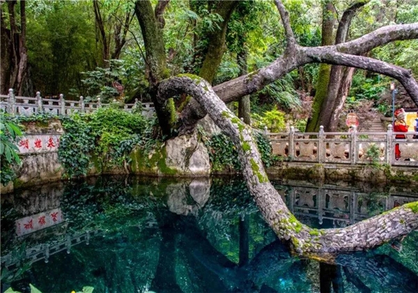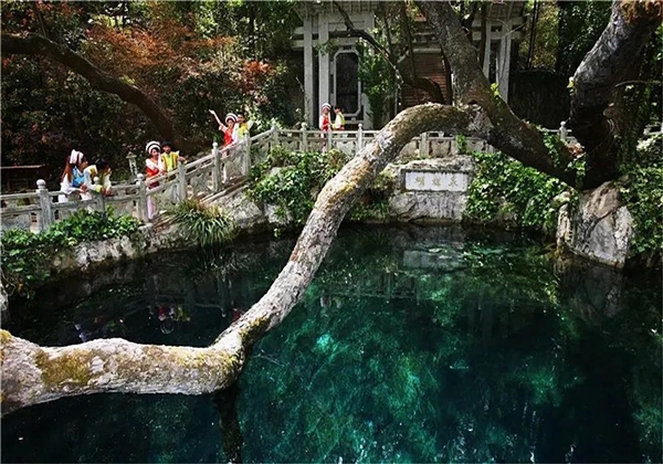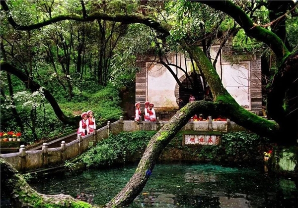 從泉底冒出,橫臥泉上的高大古樹便是合歡樹。合歡樹遒勁有力的樹干伏于泉水之上,似與泉水共纏綿。每年夏天,樹上淡黃色的花朵成片開放,遠(yuǎn)遠(yuǎn)望去,就像盤旋在枝頭的蝴蝶,蝶花相映,神秘動人。