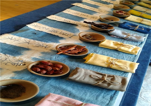走進(jìn)張家老院,細(xì)細(xì)密密納入呼吸的是布匹和染料獨(dú)有的味道,清涼而柔軟,湛藍(lán)的染缸倒映著亮汪汪的天空,墻壁上“藍(lán)續(xù)”兩個(gè)毛筆大字工整有力。小院里、二樓窗檐上懸掛著的扎染布隨風(fēng)飛舞,各個(gè)展廳里的成品各具特色。小碟子里的染料樣品和一旁的布樣互相映襯著前世今生。比如飛機(jī)草染出來(lái)的布是啞黃色,洋蔥皮染出來(lái)的是鵝黃色,紫草是紫色。