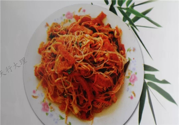 肝生用新鮮的豬肝、豬脾臟、豬皮經(jīng)過煮熟,涼后切成細絲狀,再放進熱油里炸至表皮金黃,將豬小里脊肉用勺子刮成肉末,加入適量食鹽、辣椒粉、食醋扮勻,再與豬肝、豬脾臟、豬皮混合,把它們和發(fā)好的粉絲,以及切成絲的新鮮卷心白、大白菜、胡蘿卜一起加入蔥、姜、芫荽、蒜泥等各種配料,放入適量的食醋、醬油、鹽巴、草果粉、花椒粉、油辣子等調(diào)料充分攪拌,其色紅黃白綠青橙紫,其味酸辣可口,鮮味十足,扎實誘人,讓你忍不住大塊朵頤。