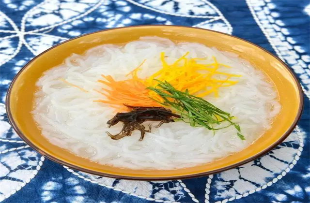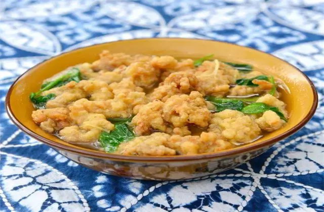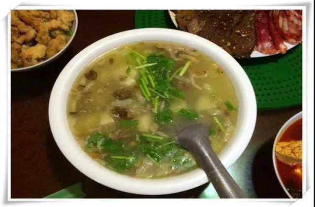 千里順風(fēng)湯別名蝦米湯:用涼粉丁﹑豆腐丁﹑蒜苗和炒米相煮而成?!八狻迸c“順”音相諧;蝦米為水中之物,順?biāo)问幭笳饕宦讽橈L(fēng)。這源于劍川木匠出門之故,家人遠(yuǎn)走它鄉(xiāng),家里的妻子都要特意為他準(zhǔn)備一包劍湖魚蝦米,以備食用。煮吃時(shí),其湯香香襲人,而且睹物思鄉(xiāng),以此寄托思親情結(jié),表示時(shí)刻不忘家中老小,象征千里順風(fēng),永戀家鄉(xiāng)。