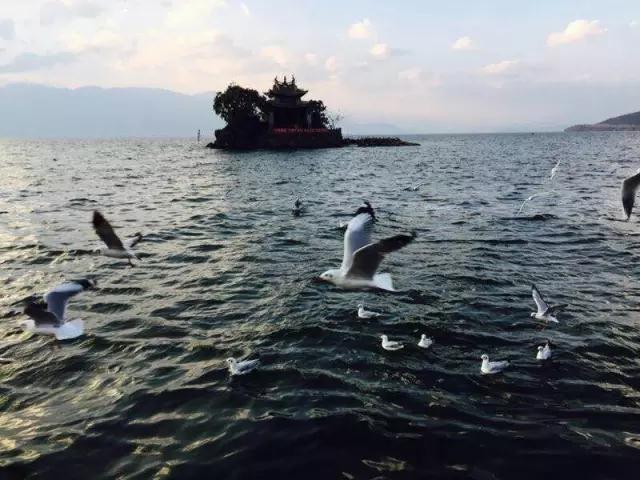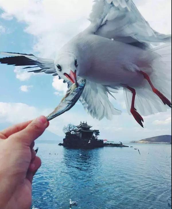 如果你在環(huán)洱海時到了小普陀,或者恰巧路過,那么你總能見到一群活潑的”小精靈”,它們或停歇,或盤旋,或飛到你的身邊嘗一嘗食物的味道。