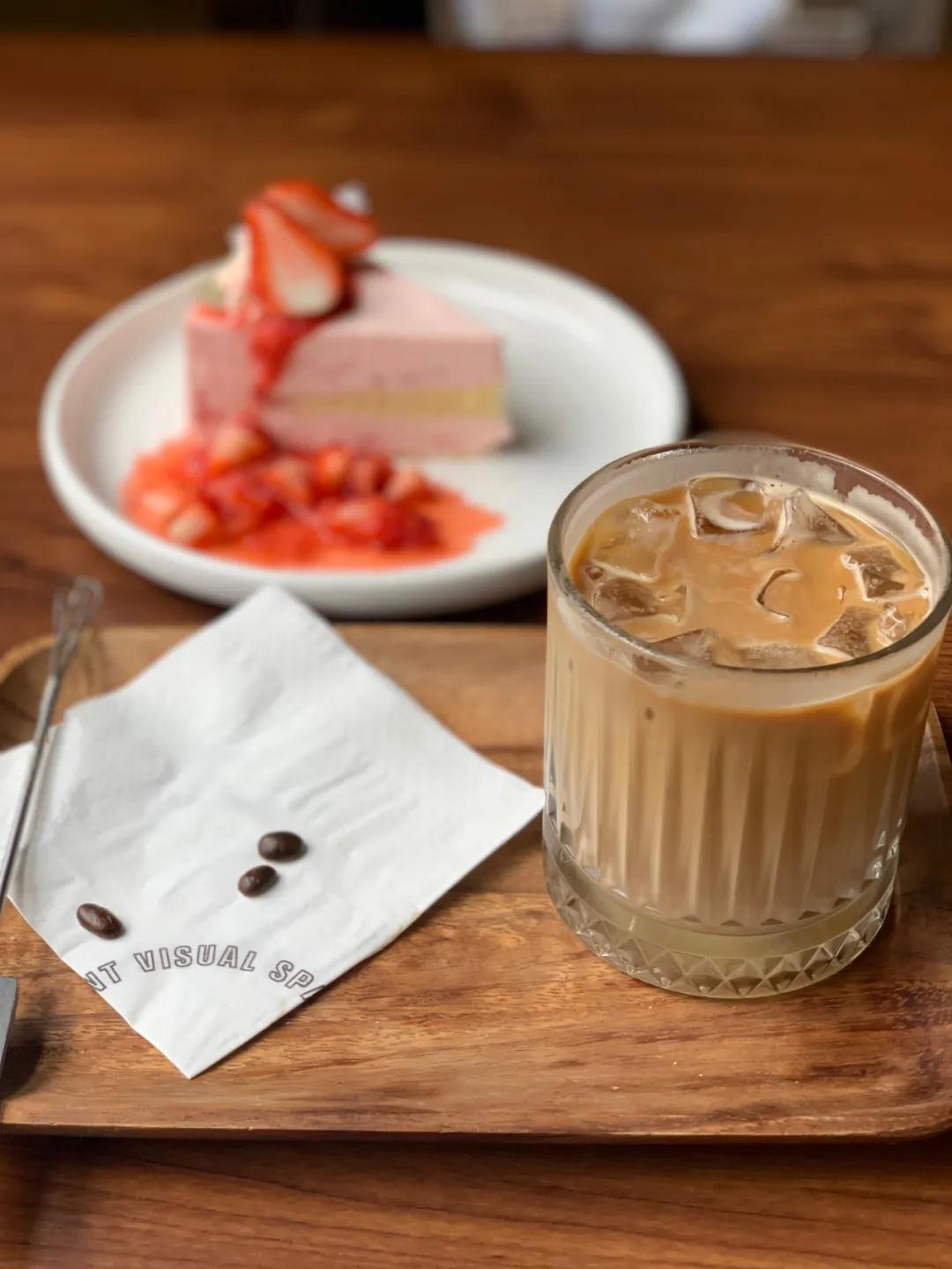 讓人驚喜的是,大眾點評5級以上的用戶,來到這里都可以免費獲得飲品或者飲品套餐,lv8的我換了一份草莓蛋糕+拿鐵,出品很棒棒呢!