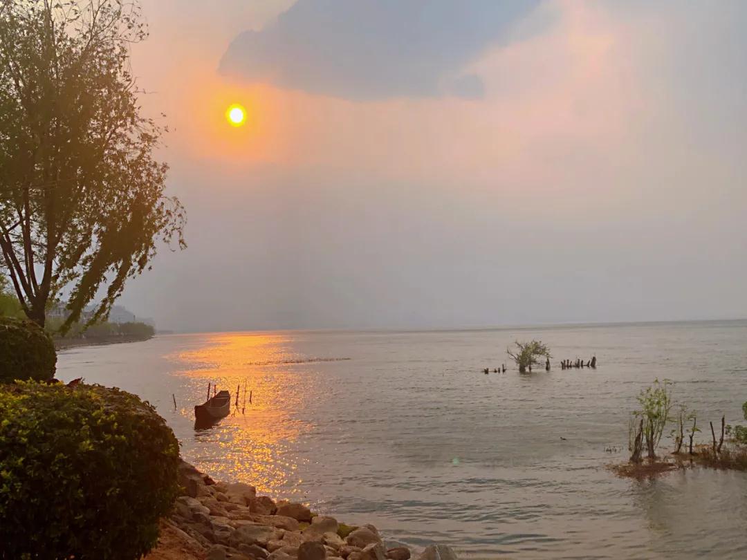 回到酒店路過洱海邊已是傍晚,太陽的金光從云的邊緣照下來,美不勝收。傍晚騎單車到海邊,就靜靜的坐著看夕陽西下,海面上水波溫柔,一條小船隨波逐流,海水變成了金色的。