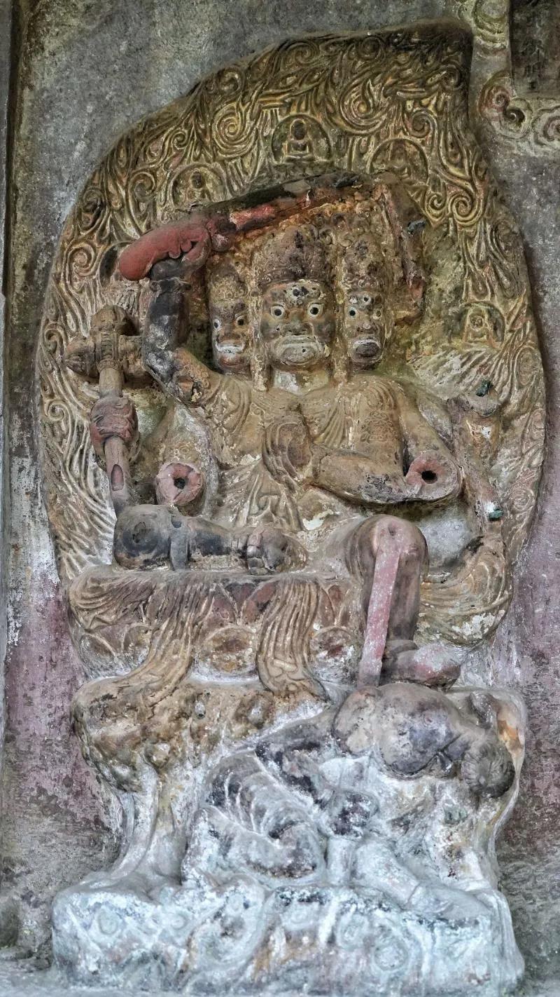 六號(hào)窟的明王堂造像場(chǎng)面宏大,是石鐘山石窟中規(guī)模最大的一窟。而更為珍貴的是窟中在釋迦佛祖及弟子的兩側(cè)雕鑿了完整的八大明王的全身像。八大明王源于《大妙金剛經(jīng)》,是八大菩薩所化現(xiàn)的忿怒相。國內(nèi)以明王為題材的石雕造像,能與之相比的只有四川大足寶頂山石窟中的十大明王造像,而后者為半身像且年代較之更晚,因此可見石鐘山石窟中明王堂造像的珍貴程度以及在國內(nèi)造像藝術(shù)史上的地位。