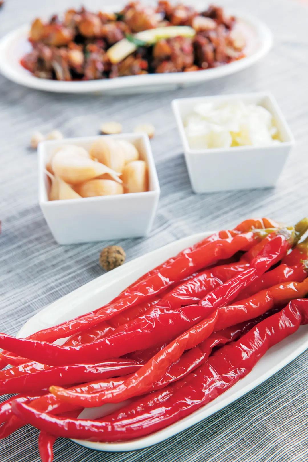 此外,傳統(tǒng)的黃燜雞,還配有泡大蒜、泡辣椒和苦菜湯,用以解油膩。一口咬下去,香辣爽口,心神俱暢。