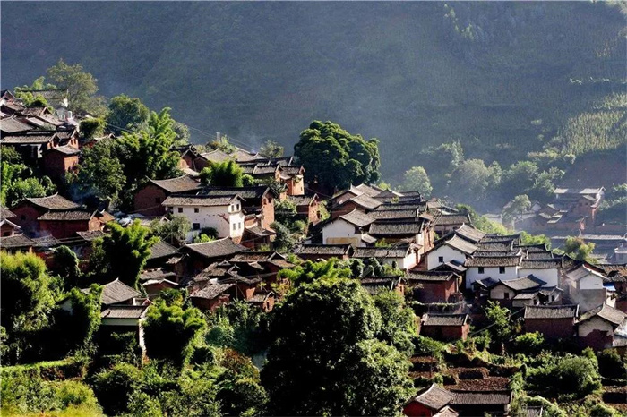 清晨,站在一處山坡往下看,崇山峻嶺間,一片屋頂在滿眼的蒼翠中露出若隱若現(xiàn)的輪廓,寂靜而又生動。