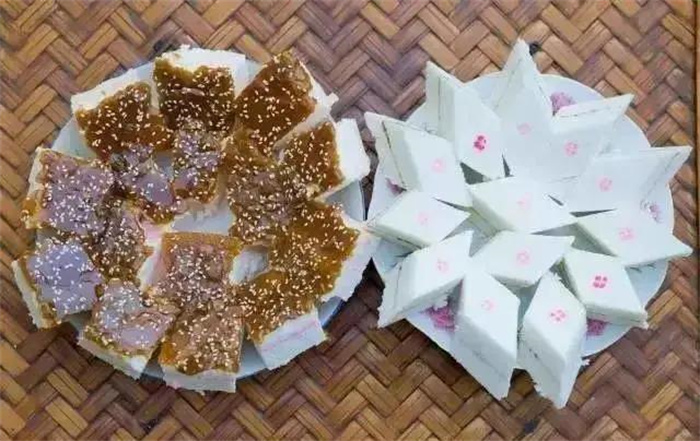 高粉制成后,加百分之一的糯米面,蒸發(fā)亦如干糕,但不加糖,待糕蒸熟后再把紅糖撒在上面,待糖蒸化后再撒上芝麻或蘇子而成。