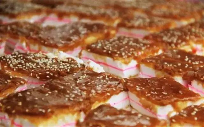 先將上等白米泡軟后,壓磨成粉,然后用薄荷、橙皮汁加紅糖將粉碾細,用細篩篩入甑子內,再用薄刀小心劃成長2寸、高1.5寸、厚0.5寸的小塊,用大火蒸熟。
