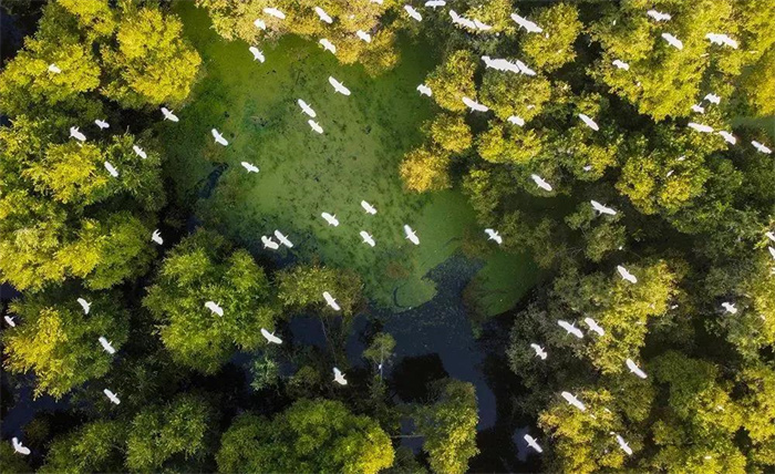 近處湖光瀲滟,水鳥(niǎo)翔集
