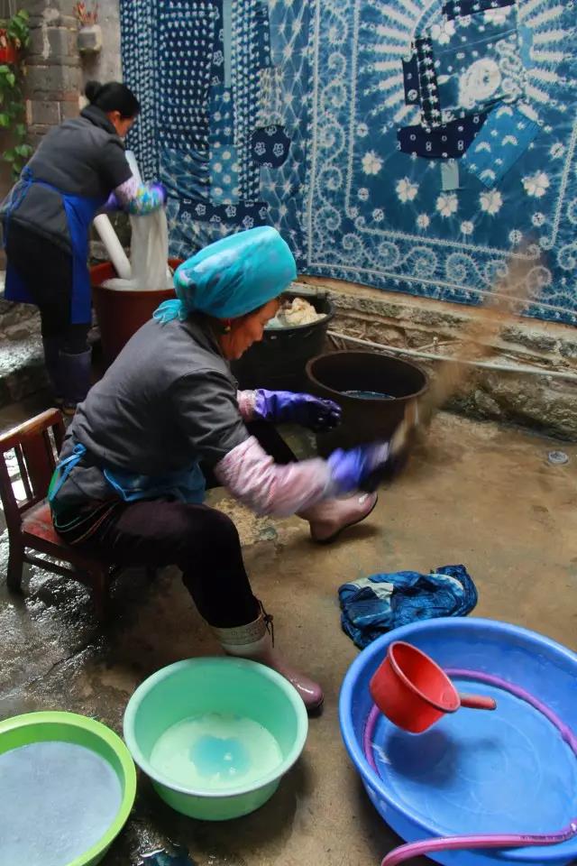 為了得到最好的染料,小白請來村里手藝精湛的老藝人進(jìn)行技術(shù)指導(dǎo)。她和同事在反復(fù)的試驗(yàn)中掌握了竅門?!袄?,染料在染色前加入白糖、米酒和草木灰等,染出的藍(lán)色才有自然的厚重感?!毙“渍f。