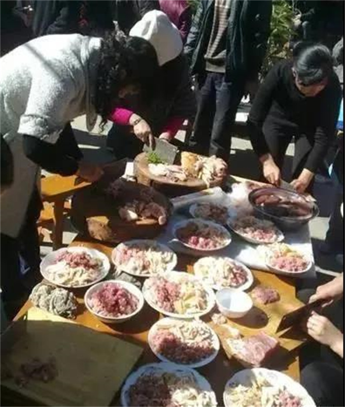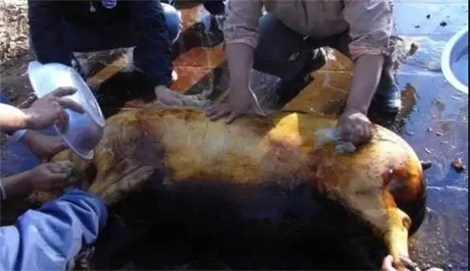 一頭豬被殺翻了,先用稻草點火,將其全身的皮子燒透,去毛,刮洗干凈。用稻草燒烤過后,整頭豬呈金黃色,皮子及其以下兩三寸的部位,實際上已經被稻草烤熟了。然后開肚解剖,趁新鮮將火燒豬肉的“不見天部分(肚底肉、后腿肉)”、豬嘴、豬肝分切成薄片或絲狀食用。
