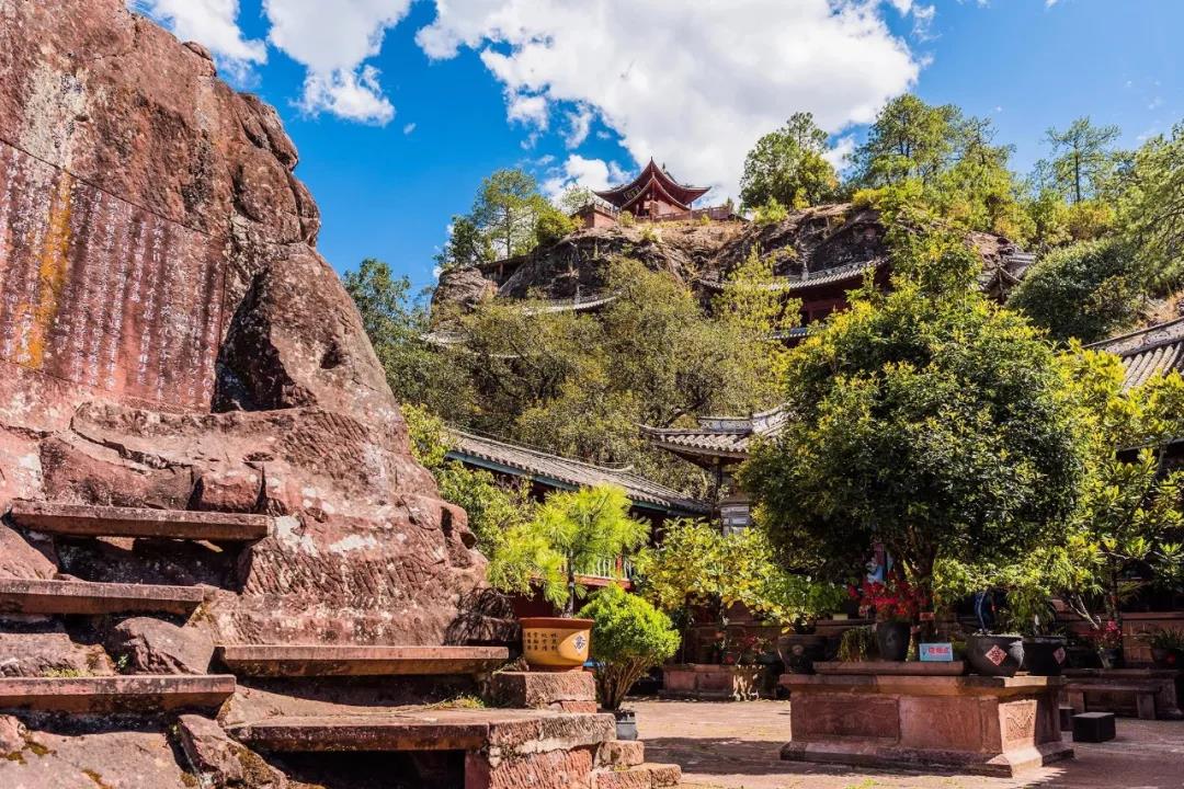 寶相寺位于佛頂山上,依山建筑在一堵高聳險峻的大石崖上,下層是大殿,二殿為寺觀,鑿石抬梁,被譽為“云南的懸空寺”。